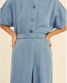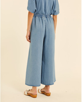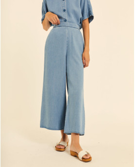 El pantalón más cómodo que tendrás en tu armario. Confeccionado en tejido de tencel, con tacto muy gustoso y fresco para el verano. Goma en la cintura. Corte culotte con largo al tobillo. Pata ancha desde la cintura.