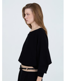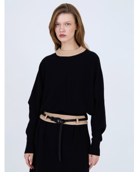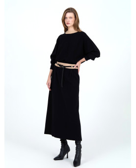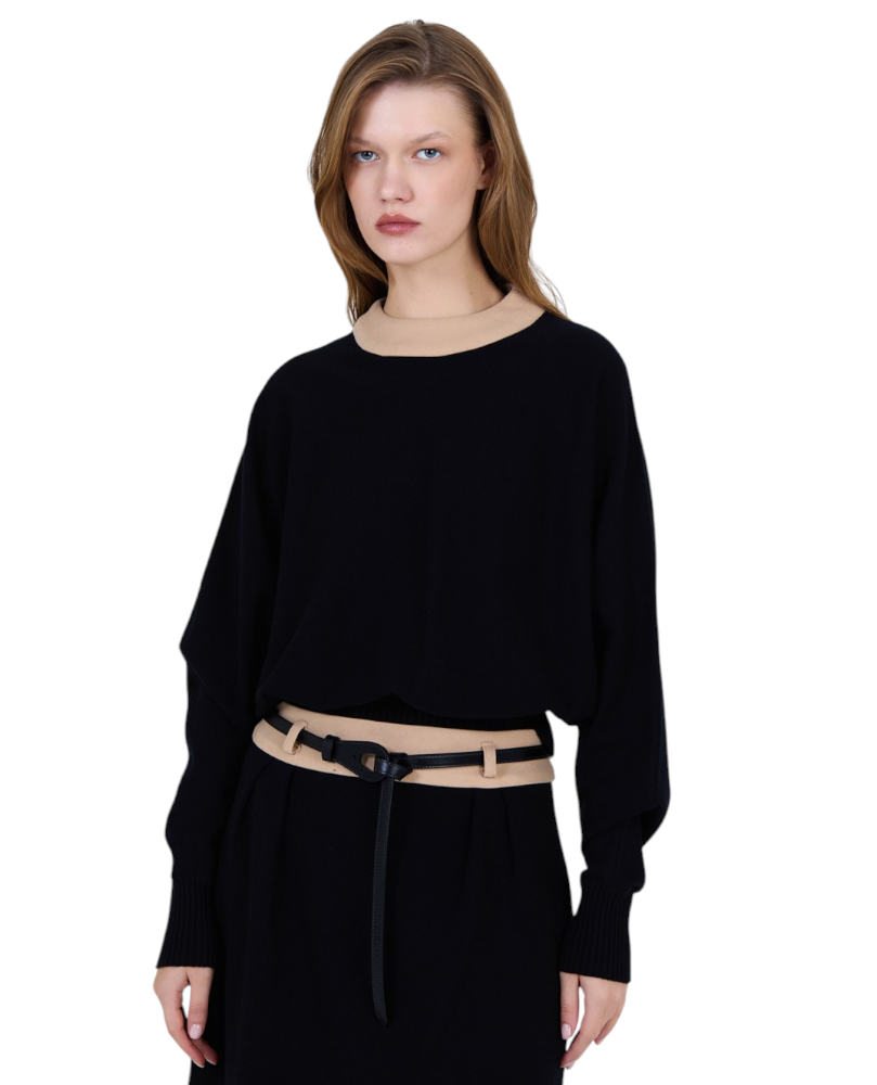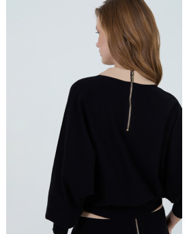 Jersey bimateria combinado cuello tejido de sarga y cuerpo en punto. Cuello redondo con cierre con cremallera en la espalda. Manga larga murciélago.