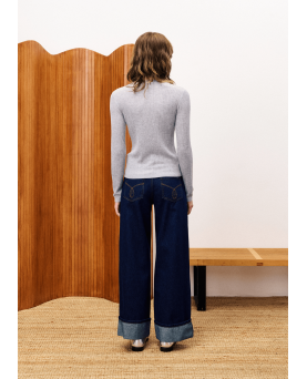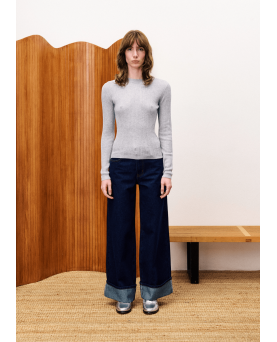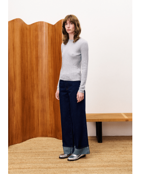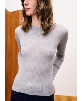 Jersey fino de canalé en color gris con hilo de lurex. Cuello redondo. Ajustado. Largo por la cintura