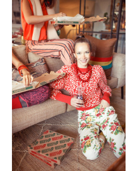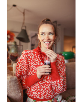 Jersey en color beige con estampado de animal print en color naranja. con cuello redondo con efecto de hombreras. Mangas abullonadas. El tejido es muy muy suave y gustoso, no pica nada. El largo es por la cintura.