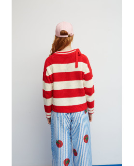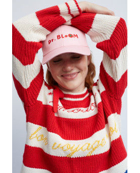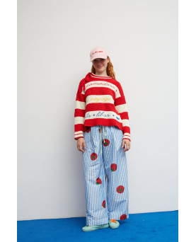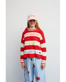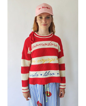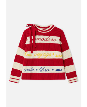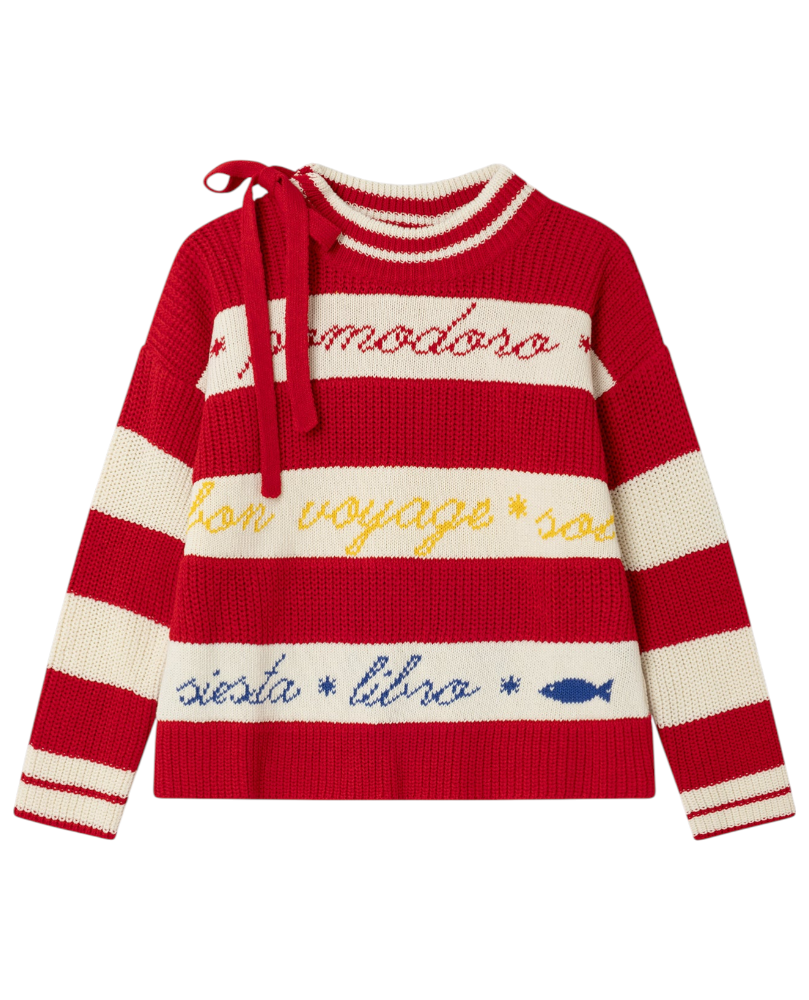 Las rayas en tonos rojo y crudo se combinan con palabras y pequeños símbolos tejidos que hablan de disfrutar, saborear y tomarse la vida con calma y como no, combinando colores para darle ese punto bloom. Cada detalle suma personalidad y convierte la prenda en algo único. El cuello con lazada aporta un aire especial y desenfadado, mientras que su punto suave y su silueta cómoda lo hacen perfecto para el día a día.