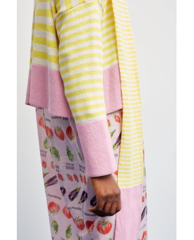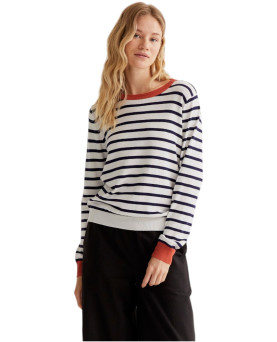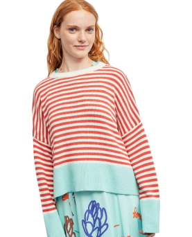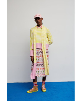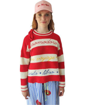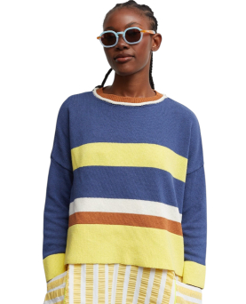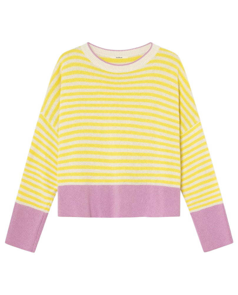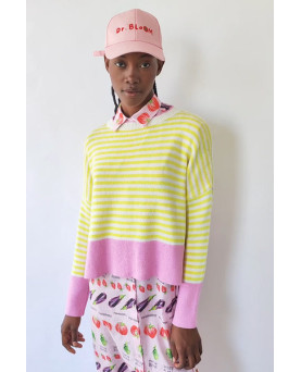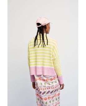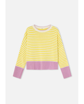 Un clásico renovado. Este jersey de rayas amarillas y blancas incorpora un toque moderno gracias a los detalles en color rosa presentes en el bajo, los puños y el ribete del cuello. El resultado es una combinación fresca, vibrante y muy favorecedora.