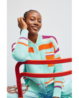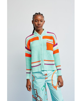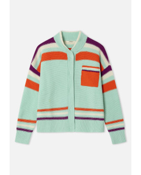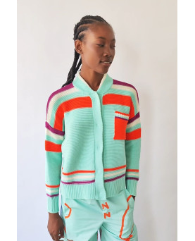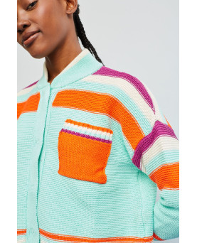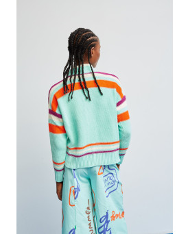 De silueta relajada y punto de algodón agradable, que mezcla franjas de colores en tonos naranja, berenjena y crudo sobre un fondo agua.