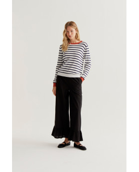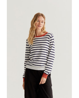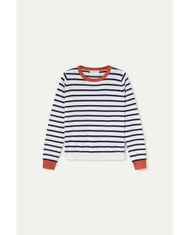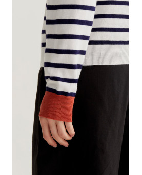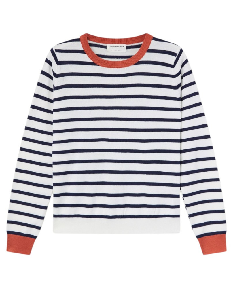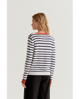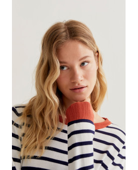 Jersey en rayas marineras en color blanco y azul marino. Detalles de rib en puños y cuello en color naranja. Corte recto y fit normal. La modelo lleva la talla S.