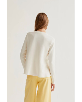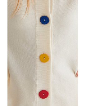 Cárdigan de tejido punto de color beige. Cuello redondo y manga larga. Cierre frontal con botones de color multicolor. Detalles acabados en rib. La modelo mide 177 cm y lleva la talla S.