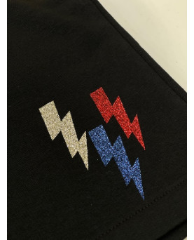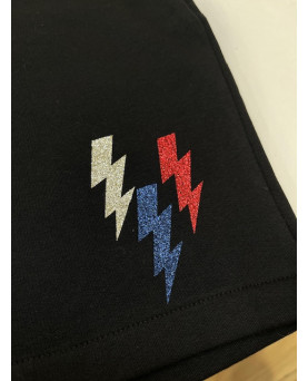 Falda de algodón tipo chandal, recta y corte fit. Con detalle de tres rayos en la parte inferior izquierda con glitter. Tiene bolsillo y un cintura de goma ajutable. Estilo sport chic.