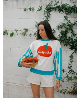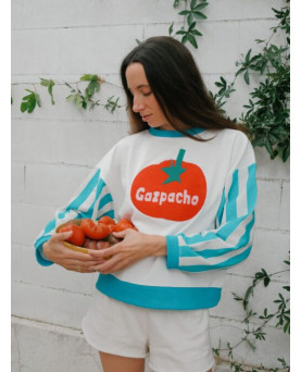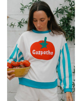 Sudadera con un divertido estampado de tomate haciendo un homenaje a nuestra infancia con el tejido de toalla. Corte ligeramente oversize, si no te gusta ese estilo puedes escoger una talla menos, pero nosotras siempre recomendamos la talla habitual.