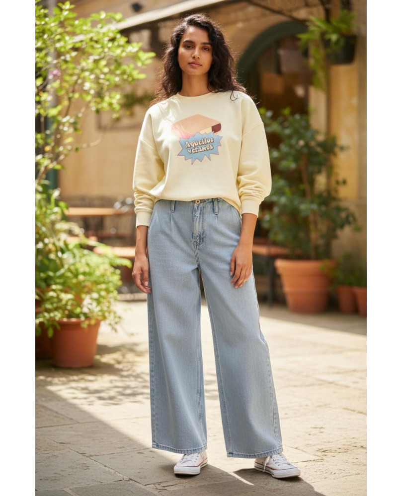Sudadera en color amarillo mantequilla con un tacto suave y gustoso. Su tejido de algodón fino la hacer perfecta para el verano porque es finita y perfecta para las noches de verano y para la primavera. Cuello redondo. Corte amplio. Te recomendamos tu talla habitual pero si no te gusta amplia puedes escoger una talla menos.