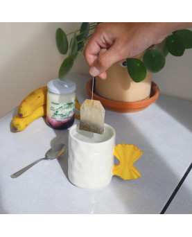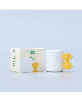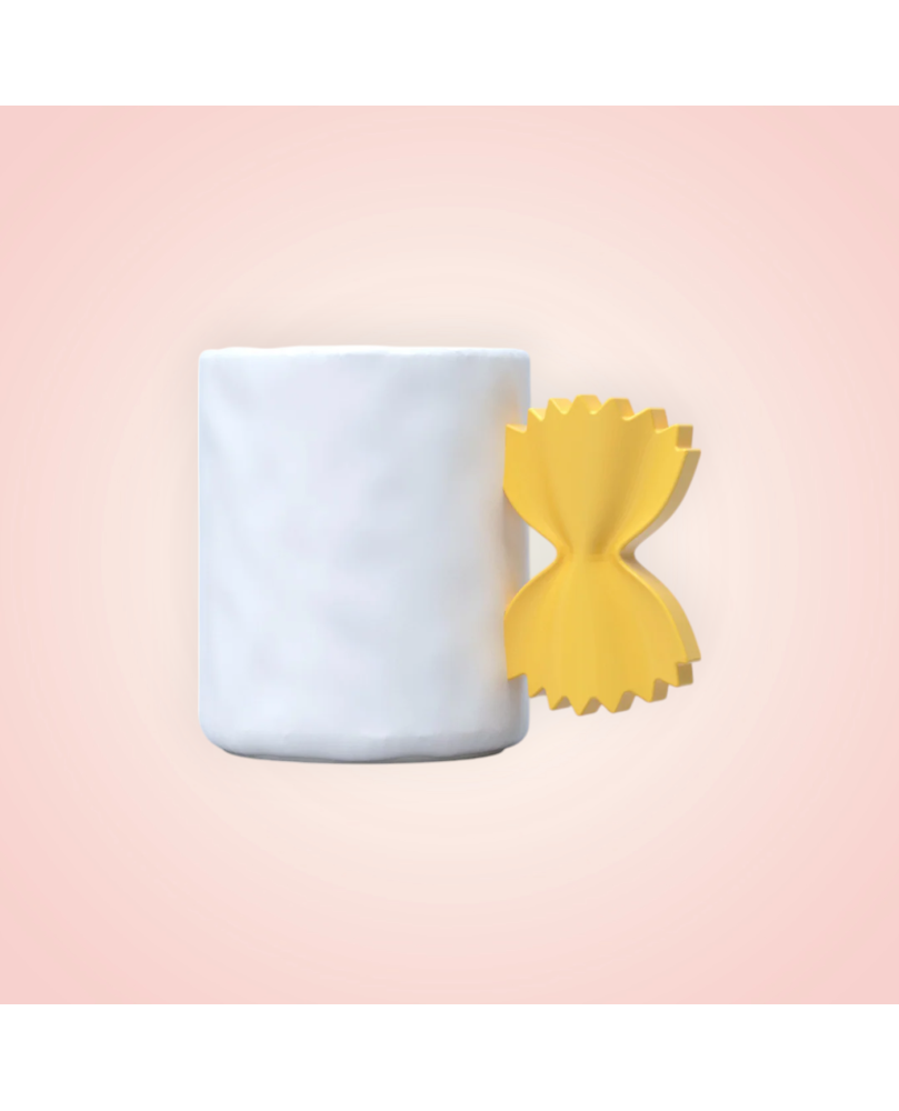 Taza de cerámica en color blanco con textura con el asa con tu forma de pasta favorita.