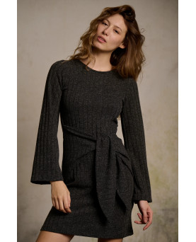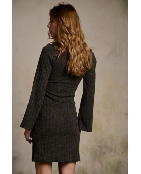 Vestido de punto canalé, con lazada en la cintura y manga acampanada. Color gris oscuro