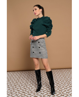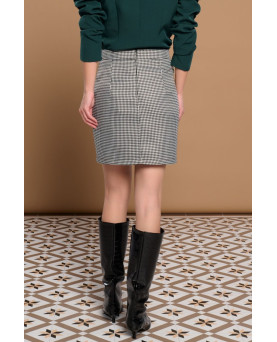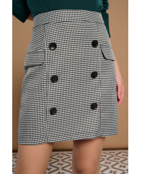 Falda corta de tiro alto con estampado pata de gallo. Falsos bolsillos laterales y detalles de botones negros en frontal. Forro interior. Cierre con cremallera oculta en costura. Cierre en espalda con abertura y botón.