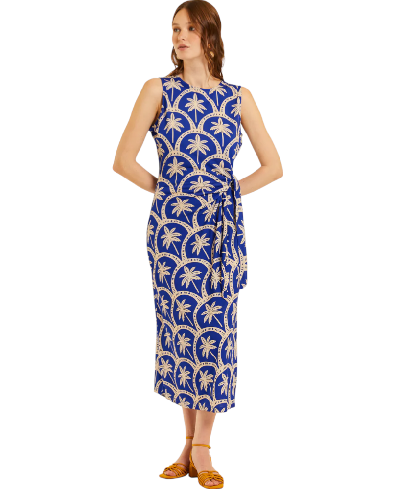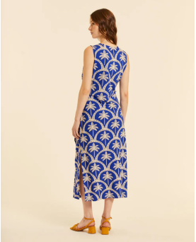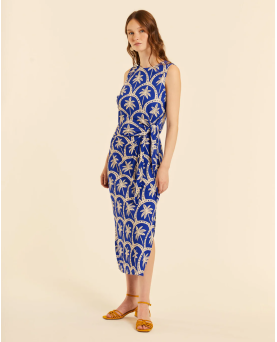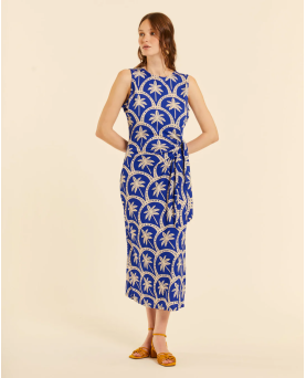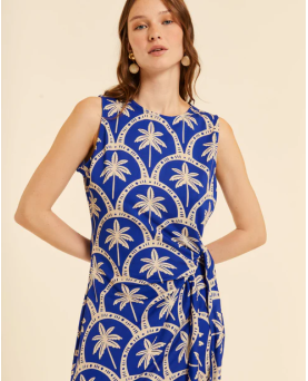 Vestido en color azul con estampado de palmeras. Largo midi con abertura lateral. Cuello redondo. Detalle de lazada en la parte delantera. Corte recto