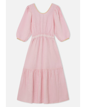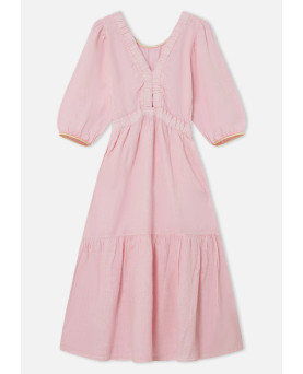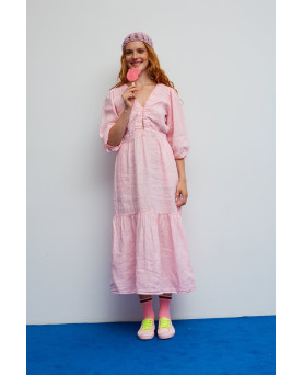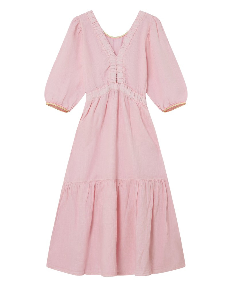 Un vestido pensado para trasmitir calma, suavidad y paseos al atardecer que nos sugieren verano en estado puro. Confeccionado en lino ligero, su tono rosa empolvado aporta un aire dulce y luminoso, perfecto para los días en los que apetece vestir cómoda pero especial. El escote en pico con delicados frunces realza la parte superior, mientras que la cintura marcada de forma natural estiliza la silueta sin renunciar a la comodidad. Las mangas abullonadas añaden volumen y movimiento, creando un equilibrio precioso entre romanticismo y frescura. La falda fluida, con ligero vuelo, acompaña cada paso con ligereza.