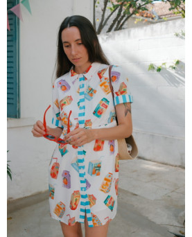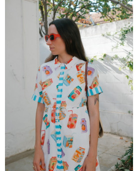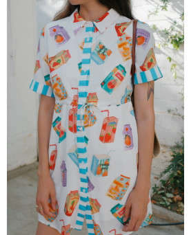 Vestido camisero en color blanco con estampado de bricks de zumo con gatitos. Abotonado del cuello al bajo con un cinturón para ajustar. Largo por encima de la rodilla. Bolsillos laterales. Con forro interior