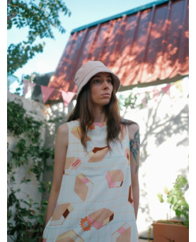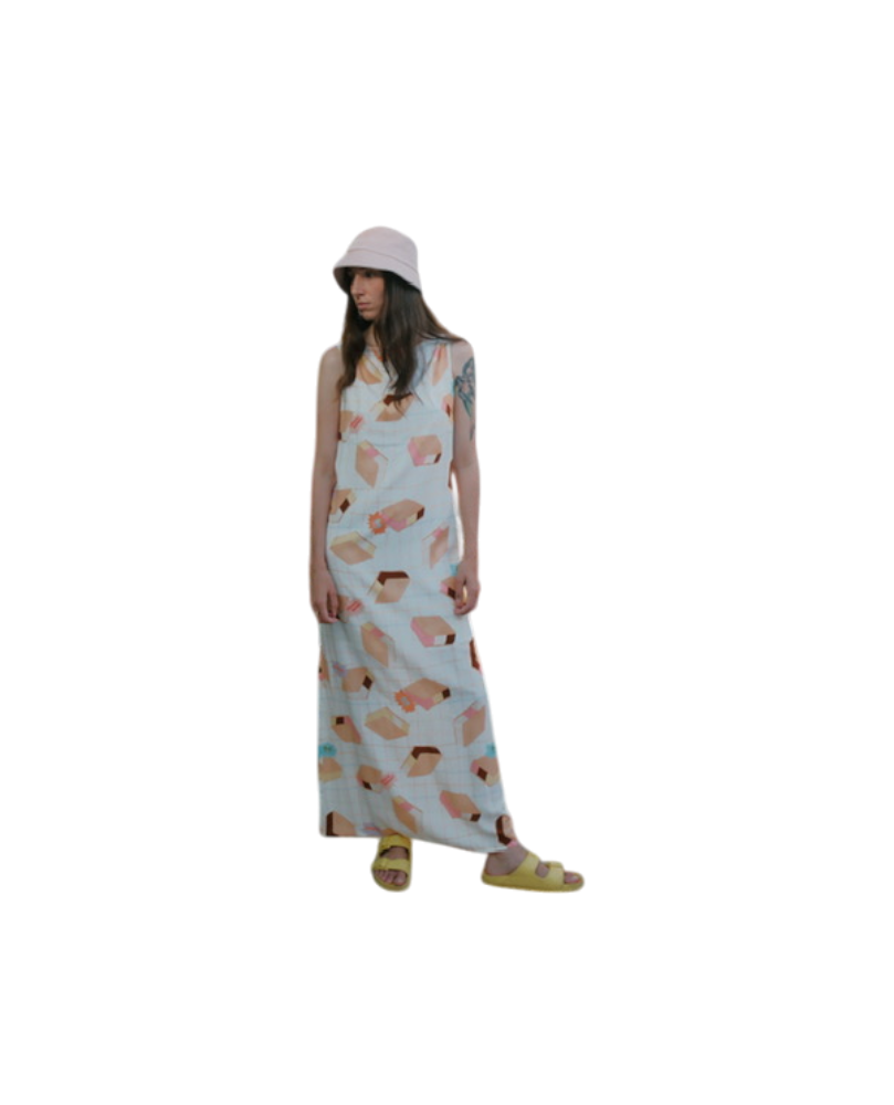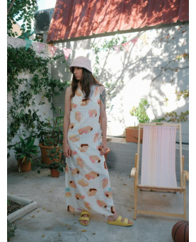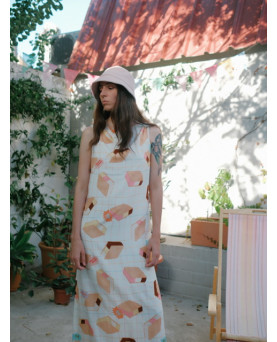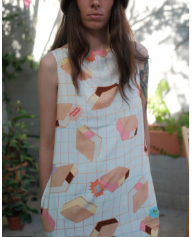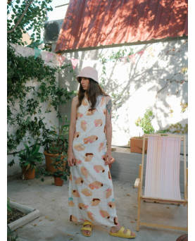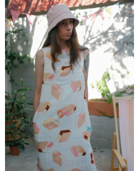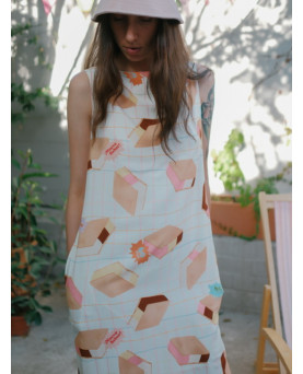 Vestido largo en corte recto con estampado de cortes de helado que te harán viajar a tu infancia. Con detalles en el cuello y mangas. Con forro. Bolsillos laterales