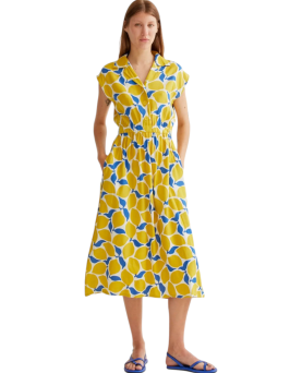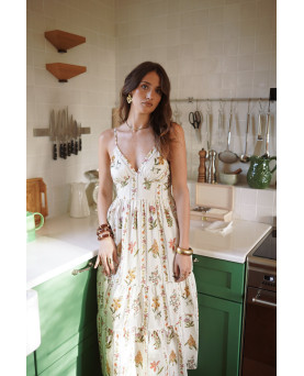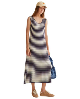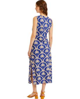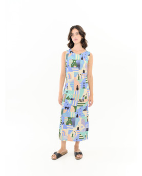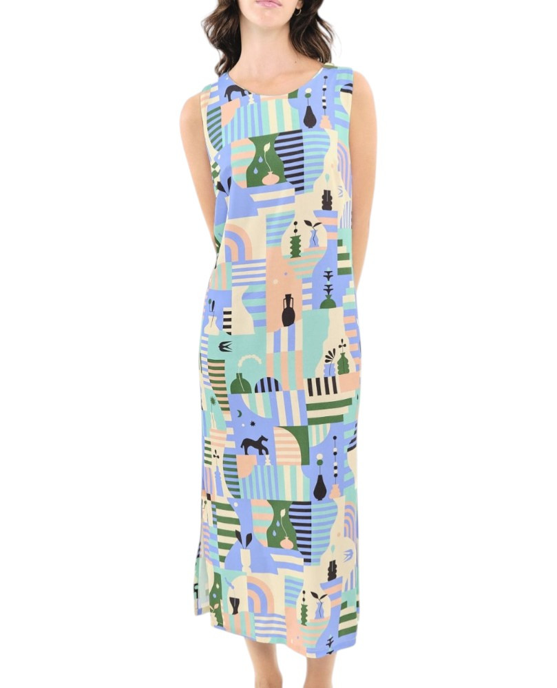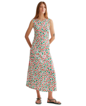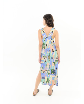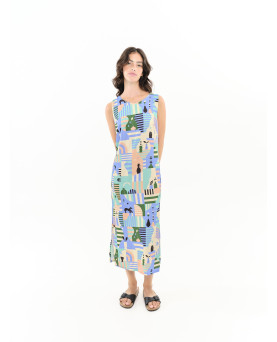 Vestido tobillero de corte recto con aberturas laterales. Detalle de tirantes cruzados en la espalda. La modelo lleva la talla S