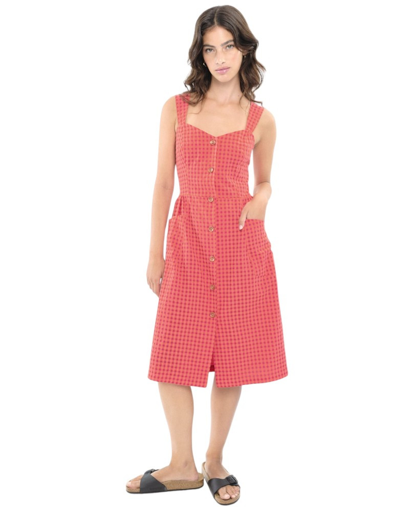 Vestido de silueta entallada con escote tipo corazón y tirantes anchos para un soporte cómodo. Cierre frontal con botones. Prácticos bolsillos laterales tipo parche. En la espalda incorpora gomas de nido de abeja que asegura un ajuste perfecto al cuerpo. La modelo lleva la talla S.