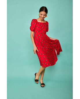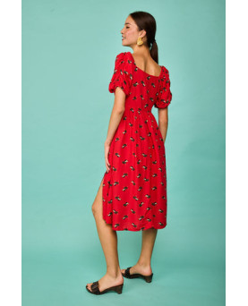 Vestido escote corte cuadrado y manga abullonada, corte de pecho pegadito y la falda con vuelo y abertura lateral que lo hace más sexi.