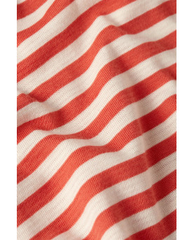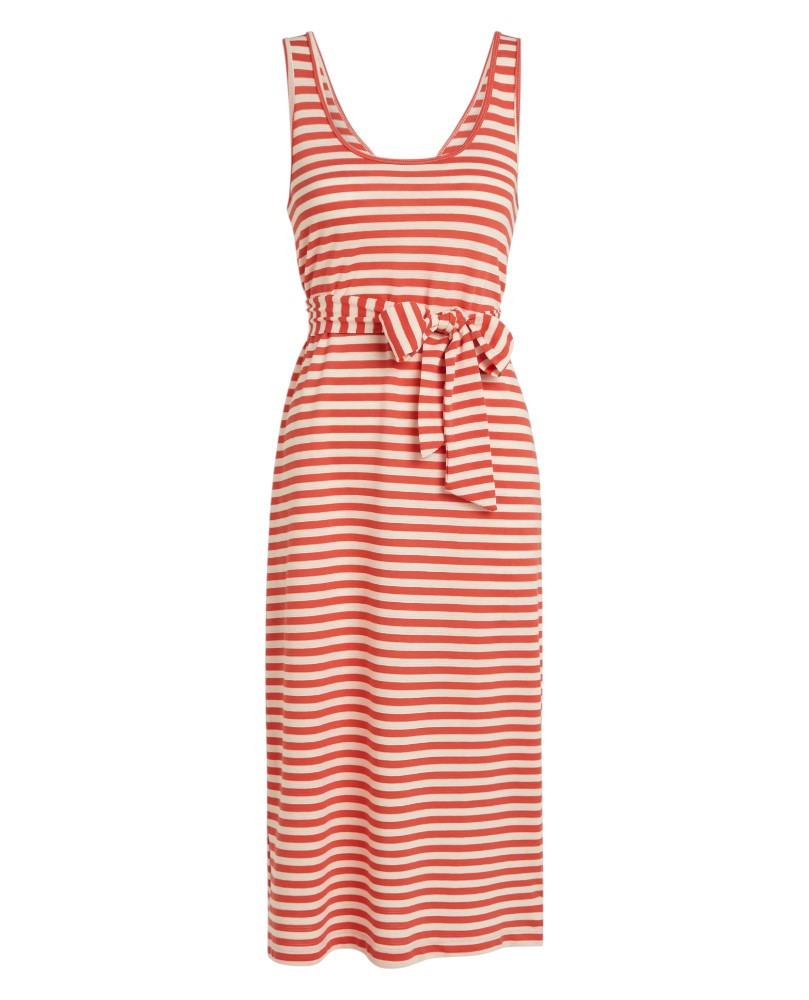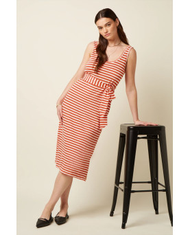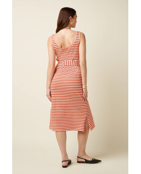 Vestido confeccionado en algodón orgánico en rayas horizontales en color beige y rojo coral. Escote redondo en pecho y espalda. Corte recto con lazada a juego para ajustar la cintura. Aberturas laterales. Largo por la rodilla.