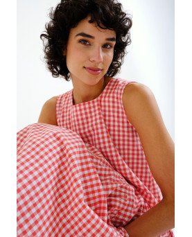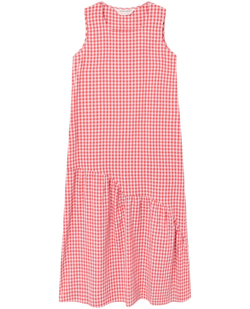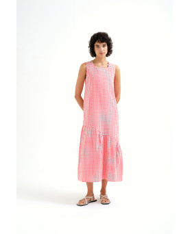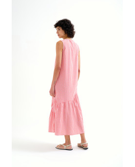Vestido de cuadros vichy rojos. Corte recto sin ser entallado. Volante en el bajo en diagonal que le aporta un bonito movimiento. Sin mangas y largo por el tobillo. La modelo mide 177 cm y lleva la talla S.