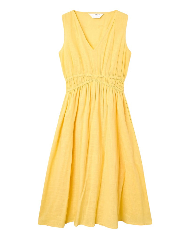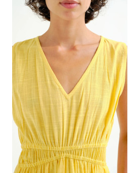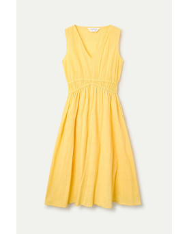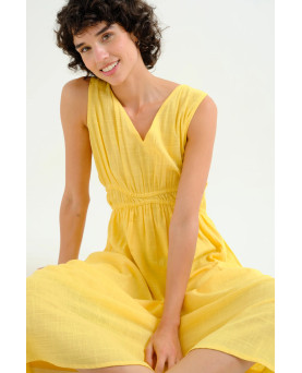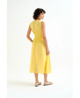 Vestido midi de tejido 100% algodón de color amarillo. Escote pico y sin mangas. Detalle de ajuste elástico en cintura. Forro interior. La modelo mide 175 cm y lleva la talla S.